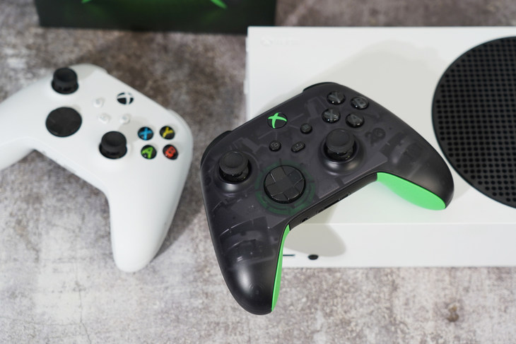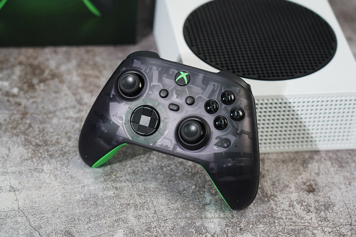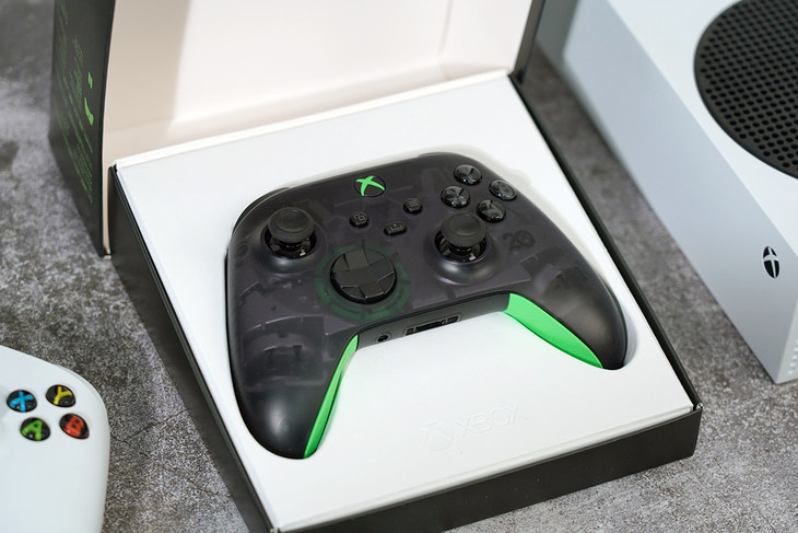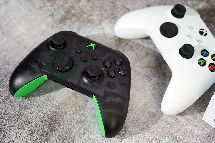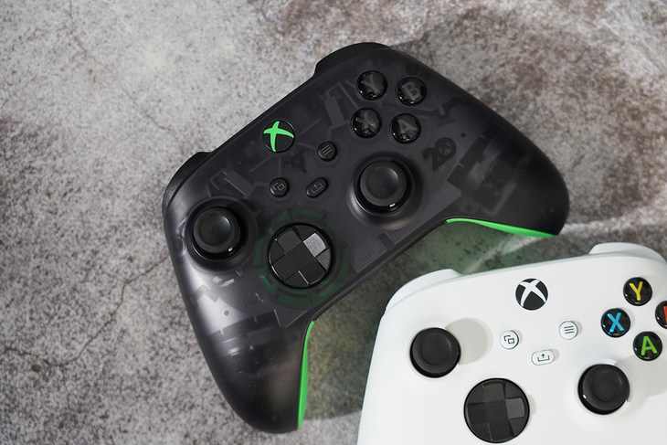 相較于經(jīng)典的白色手柄,XBOX 20周年限定版手柄多了一些科技氣息,并且在外觀上也更加的個性化,我們可以看到,XBOX 20周年限定版手柄的十字方向鍵周圍也有一圈綠色的圓環(huán),也起到了點綴的作用。