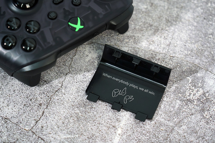 XBOX 20周年限定版手柄還有一個小彩蛋,取下電池蓋可以看到菲爾·斯賓塞的簽名以及他的一句名言,When everybody plays, we all win。