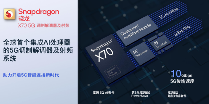 高通這一次在MWC 2022上推出了驍龍X70 5G調(diào)制解調(diào)器,根據(jù)高通官方的介紹,驍龍X70 5G調(diào)制解調(diào)器是全球首個(gè)集成5G AI處理器的調(diào)制解調(diào)器及射頻系統(tǒng);支持10Gbps 5G傳輸速度,也就是萬(wàn)兆級(jí)的傳輸速度,以及同樣驚人的3.5Gbps上行速率。驍龍X70 5G調(diào)制解調(diào)器對(duì)于全球范圍的運(yùn)營(yíng)商和手機(jī)廠商來(lái)說(shuō),其可以支持覆蓋到從600MHz到41GHz的全部5G商用頻段,并且實(shí)現(xiàn)對(duì)毫米波與Sub-6GHz的聚合。而高通方面預(yù)計(jì)這一個(gè),驍龍X70 5G調(diào)制解調(diào)器將在2022年下半年開(kāi)始為客戶供貨,2022年末期會(huì)有眾多采用驍龍X70 5G調(diào)制解調(diào)器的產(chǎn)品上市。