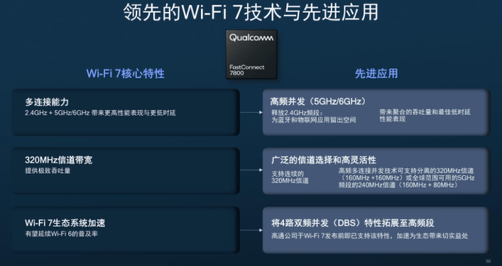 高通除了發(fā)布全新的驍龍X70 5G調(diào)制解調(diào)器外,還帶來(lái)了商業(yè)的Wi-Fi 7 解決方案,高通推出這一個(gè)方案為——FastConnect 7800移動(dòng)連接系統(tǒng),可以提供Wi-Fi 7和藍(lán)牙的鏈接,在WiFi鏈接方面,支持 5GHz、6GHz 以及 2.4GHz 頻段的接入,并可同時(shí)利用兩個(gè) Wi-Fi 射頻,在 5GHz 和 / 或 6GHz 頻段實(shí)現(xiàn)四路數(shù)據(jù)流的高頻連接。而根據(jù)高通官方的介紹, 320MHz 信道或配對(duì)的 160MHz 信道,F(xiàn)astConnect 7800 的峰值速度可達(dá)5.8Gbps;針對(duì) 6GHz 頻譜不可用地區(qū),峰值速度可達(dá) 4.3Gbps。