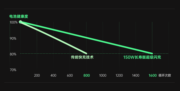 OPPO則在MWC 2022展出了兩項(xiàng)充電技術(shù),速度分別達(dá)到了150W和240W。而在這兩項(xiàng)充電技術(shù)上,OPPO其中的150W充電技術(shù)采用了OPPO的電荷泵直充技術(shù),能在5分鐘內(nèi)將等效4500mAh的電池從1%充到50%,最快15分鐘充滿。而OPPO的這一個(gè)長(zhǎng)壽版超級(jí)閃充技術(shù)是采用了OPPO自研的電池健康引擎進(jìn)行管理的,在150W的充電速度下,滿充滿放1600次后,OPPO官方測(cè)得電池還能具有80%的容量,是目前行業(yè)標(biāo)準(zhǔn)的兩倍。
