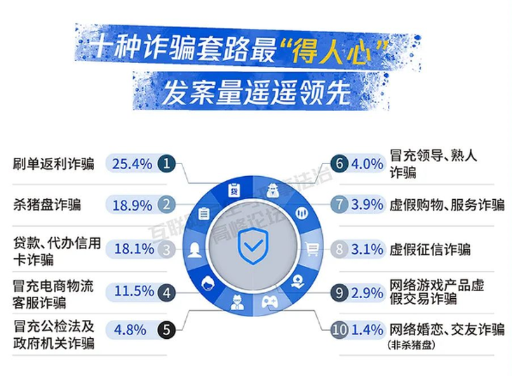 ? ? 報(bào)告盤(pán)點(diǎn)出十大詐騙套路:刷單返利詐騙、殺豬盤(pán)詐騙、貸款代辦信用卡詐騙、冒充電商物流客服詐騙、冒充公檢法及政府機(jī)關(guān)詐騙、冒充領(lǐng)導(dǎo)數(shù)人詐騙、虛假購(gòu)物服務(wù)詐騙、虛假征信詐騙、網(wǎng)絡(luò)游戲產(chǎn)品虛假交易詐騙、網(wǎng)絡(luò)婚戀交友詐騙(非殺豬盤(pán))。