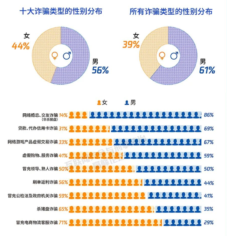 ? ? 報(bào)告還顯示,男性比女性更容易被騙,十大詐騙類(lèi)型中,男性占比56%;所有詐騙類(lèi)型中,男性占比61%。