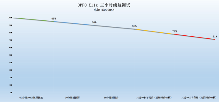 泡泡網(wǎng)在OPPO K11x開啟50%亮度、開啟50%音量,連接到WiFi網(wǎng)絡(luò)的情況下,對其進行了3小時連續(xù)測試,具體內(nèi)容包括:1小時1080P B站在線視頻播放、30分鐘微博瀏覽、30分鐘短視頻瀏覽、30分鐘《和平精英》(流暢畫質(zhì)+40幀)、30分鐘《王者榮耀》(高清畫質(zhì)+60幀)。