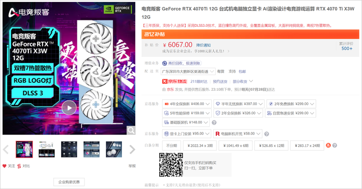 目前電競叛客RTX4070Ti正參加京東百億補貼活動,特惠價僅6067元,處于京東自營RTX4070Ti顯卡非常低的價位水平,相當(dāng)值得關(guān)注。