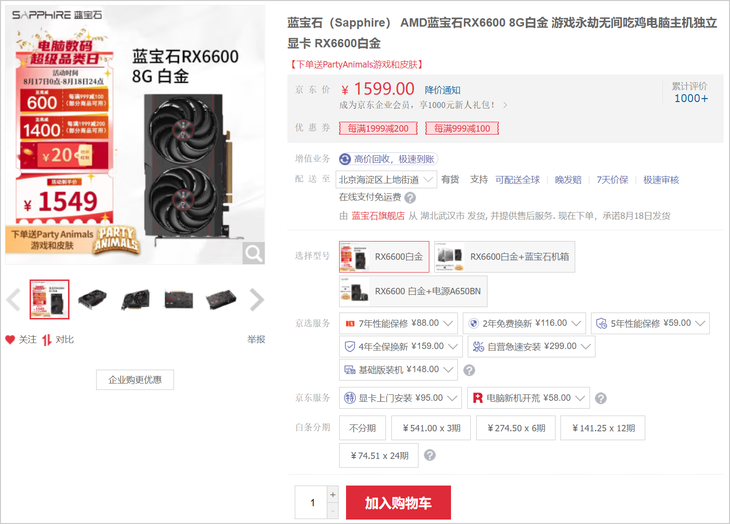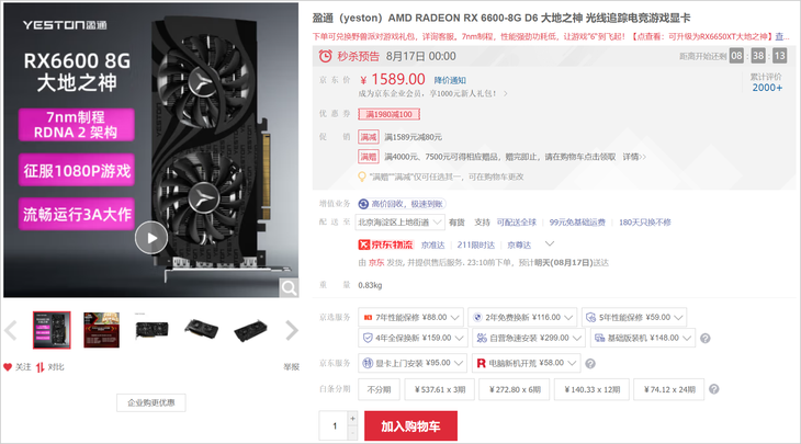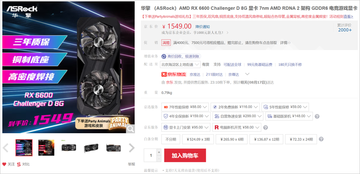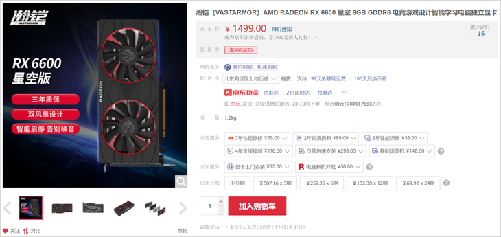 瀚鎧RX 6600星空顯卡,目前售價1499元。8月17日開始可使用50元優(yōu)惠券。