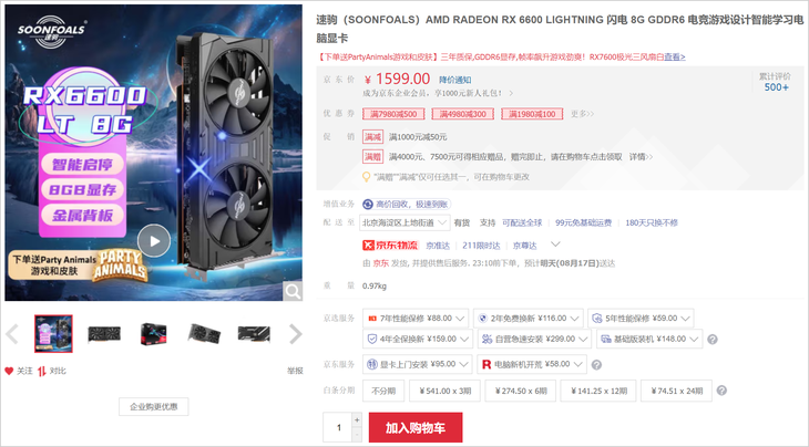 速駒RX 6600 LIGHTNING閃電顯卡,目前參加滿1000元減50元活動,預(yù)計到手價1549元。