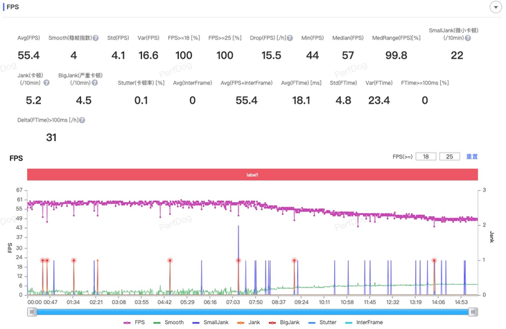 《原神》在最 高畫質(zhì)下選擇60幀模式,PerfDog測試平均幀率為55.4FPS。在游戲過程中,進(jìn)行到8分鐘左右,幀率會緩慢下降,最終維持在50FPS的水平。雖然幀率會有一定的降低,但是我們可以看到游戲過程的幀率曲線是非常穩(wěn)定的,代表手機(jī)并沒有明顯的卡頓情況,流暢度得到了保障。