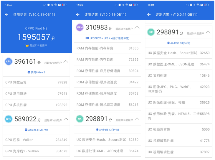 得益于優(yōu)秀的硬件配置,OPPO Find N3在安兔兔上的測試結(jié)果達(dá)到了1595057分,是一個相當(dāng)出色的成績。