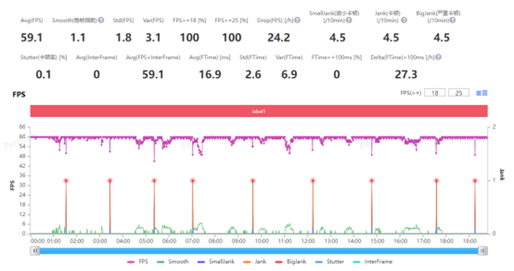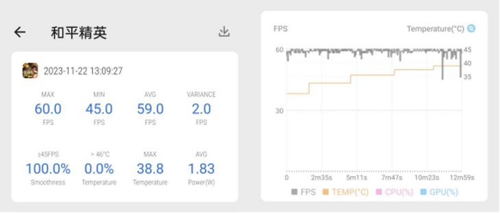Reno 11 Pro 跑到了 59.1 幀的平均幀率,并且波動(dòng)幅度不大,全程基本保持在 48 幀以上,可以說(shuō)是又流暢又穩(wěn)。