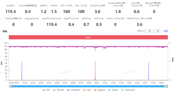 16 分鐘全程保持在 120 幀上下,幀數(shù)圖穩(wěn)得就像一條直線,基本沒(méi)有人眼能感知到的掉幀。