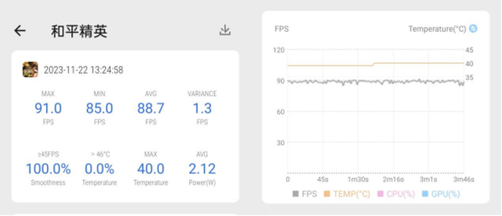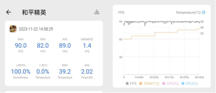 在《和平精英》項(xiàng)目中,開(kāi)啟電競(jìng)模式,選擇流暢畫(huà)質(zhì) + 90 幀,Reno 11 Pro 仍然穩(wěn)成一條直線: