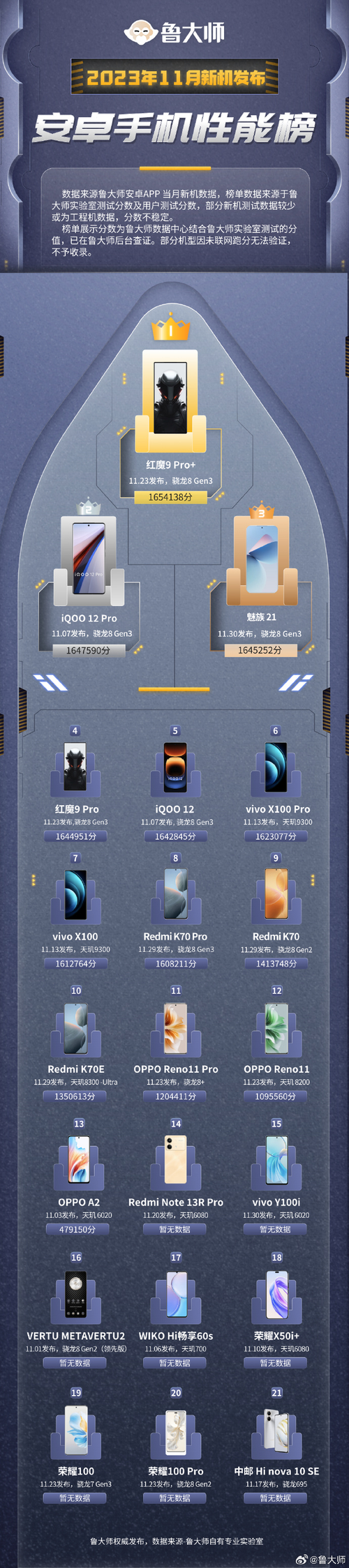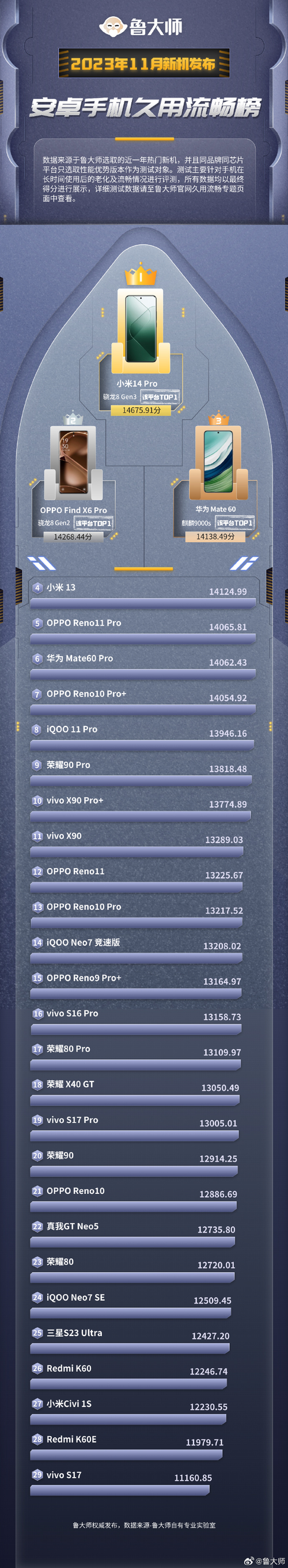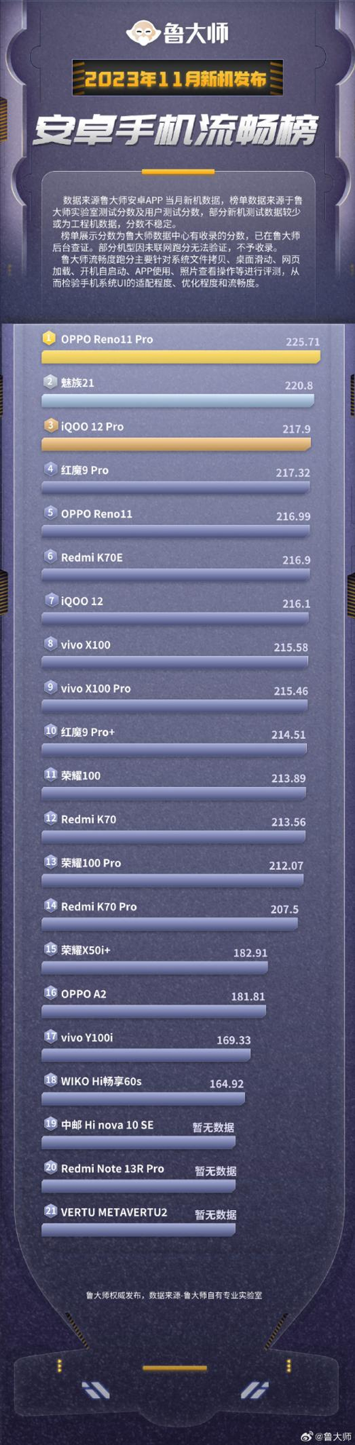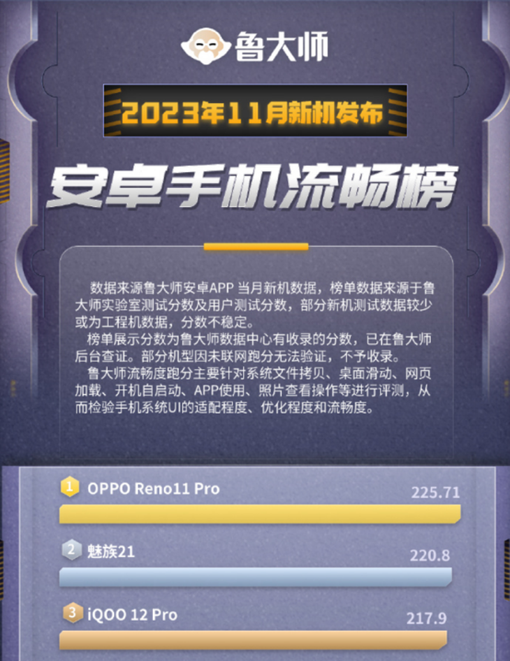 日前,魯大師公布了基于11月新機(jī)整理的三大榜單,分別是安卓手機(jī)性能榜、安卓手機(jī)流暢榜以及安卓手機(jī)久用流暢榜。作為剛剛發(fā)布的新機(jī),OPPO Reno11 Pro也成為11月安卓手機(jī)流暢榜的No .1,在久用流暢榜中,OPPO Reno11 Pro也獲得了第5名的好成績。