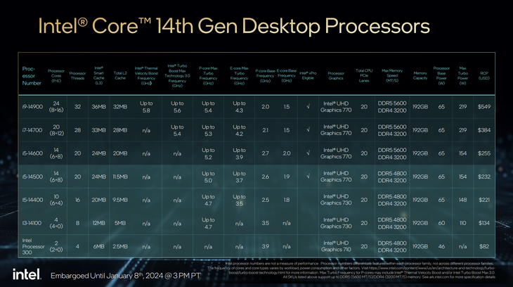 在目前進(jìn)行的CES 2024上,英特爾酷睿第14代臺式機(jī)處理器鎖倍頻版大量登場。新品總計包括18款,包括酷睿i9-14900、酷睿i5-14400F等等,涵蓋i9、i7、i5,以及英特爾Processor 300系列。