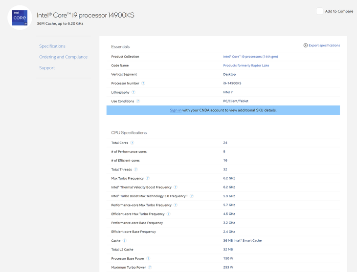 英特爾官方網(wǎng)站酷睿i9-14900KS產(chǎn)品頁鏈接: