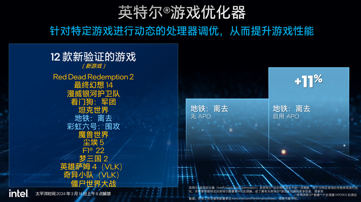 另,去年10月份,借著酷睿14代臺式機處理器發(fā)布的契機,英特爾推出了一款主要針對游戲優(yōu)化的程序——英特爾應(yīng)用優(yōu)化器(APO),主要目的為提升游戲性能。這款軟件僅支持“K”系列處理器。目前英特爾應(yīng)用優(yōu)化器(APO)已支持多達14款游戲,搭配全新酷睿i9-14900KS使用能夠在指定游戲中獲得更出色的性能體驗。