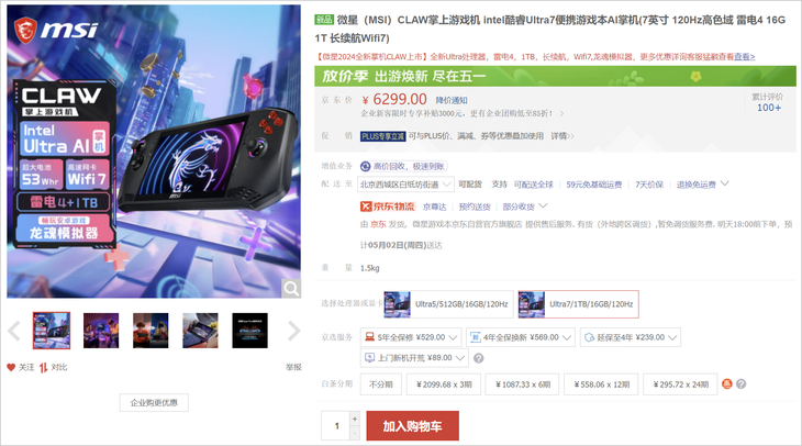 如果你已心儀微星Claw掌上游戲機(jī)很久,可以到京東商城購(gòu)買(mǎi)。目前Ultra 7處理器版本的售價(jià)為6299元,Ultra 5處理器版本的售價(jià)為4999元。