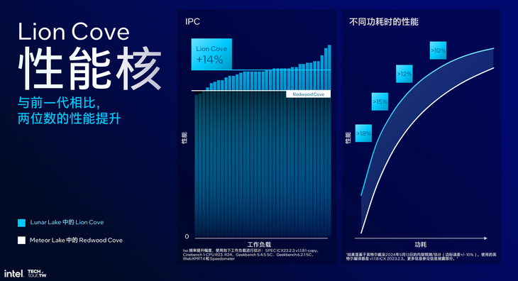 先看性能核的表現(xiàn)。英特爾官方數(shù)據(jù)顯示,Lunar Lake的性能核相比Meteor Lake的性能核,IPC性能平均提升約14%。
