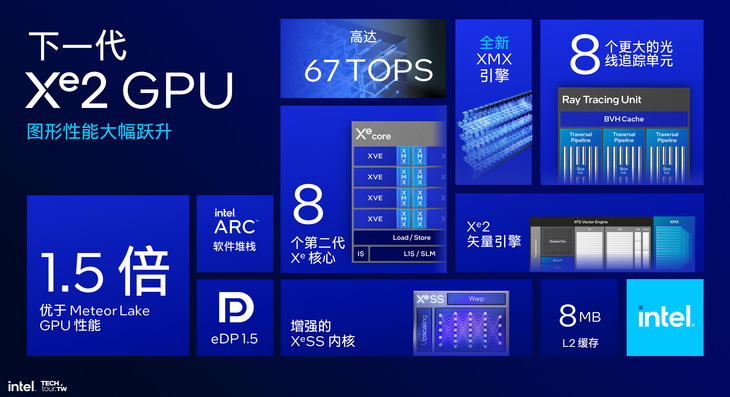Lunar Lake架構(gòu)處理器的核芯顯卡也進(jìn)行了全新設(shè)計,是全新的顯卡架構(gòu),圖形性能至高可達(dá)Meteor Lake核芯顯卡的1.5倍。