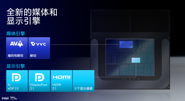 Xe 2 GPU此次還擁有全新的媒體和顯示引擎。其中在媒體引擎部分,不僅支持AV1編解碼,而且還支持VVC解碼。