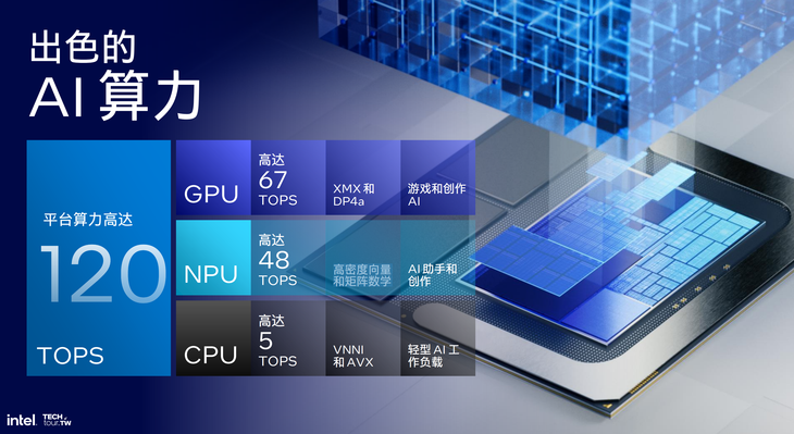 Lunar Lake架構(gòu)處理器的CPU AI算力高達(dá)5 TOPS,GPU算力高達(dá)67 TOPS,NPU算力高達(dá)48 TOPS??偲脚_算力突破100 TOPS,這對于主要面向超輕薄移動PC平臺的處理器來說,已經(jīng)很強(qiáng)大了。