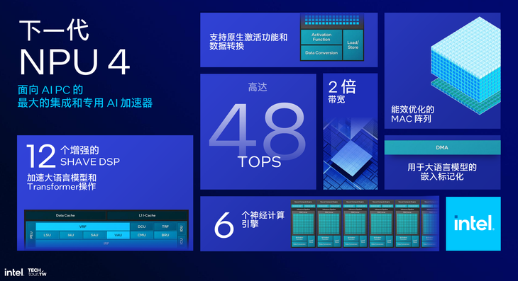 此次,英特爾還為Lunar Lake架構(gòu)處理器設(shè)計了全新的NPU 4.0,利用高密度向量和矩陣數(shù)學(xué),能夠?qū)崿F(xiàn)AI輔助運(yùn)算能力。