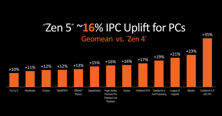 性能方面,對(duì)比上一代Zen 4,全新銳龍9000系列臺(tái)式機(jī)處理器的平均IPC性能提升約16%。