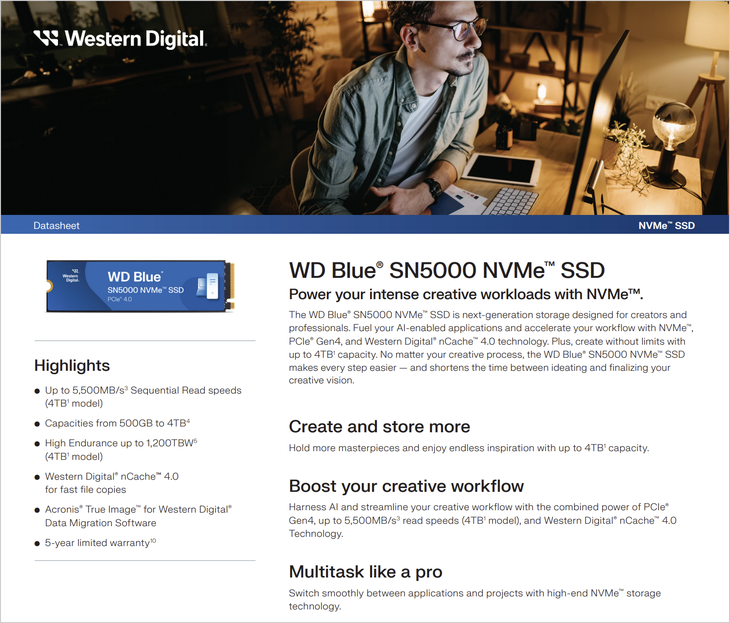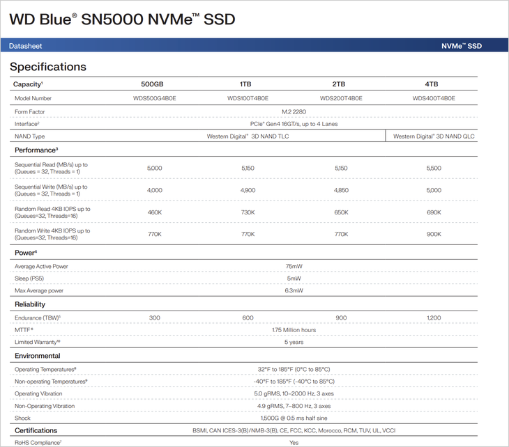 西部數(shù)據(jù)SN5000系列PCIe4.0固態(tài)硬盤登場:容量至高4TB,速度至高5500MB/s