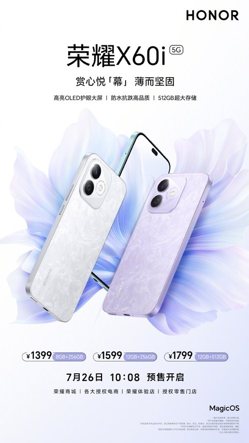 榮耀新款千元機(jī)榮耀X60i現(xiàn)已開啟預(yù)售,8月2日正式上市。其提供幻夜黑、珊瑚紫、月影白、云水藍(lán)這4種外觀版本。存儲(chǔ)版本提供3種,分別為8GB+256GB版本1399元、12GB+256GB版本1599元、12GB+512GB版本1799元。