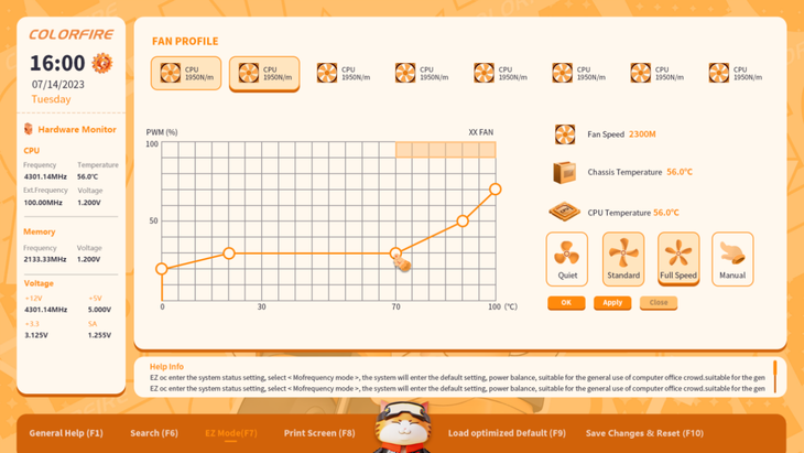 在新版BIOS主頁(yè)的左側(cè)新增的快捷選項(xiàng)與功能開(kāi)關(guān),整合了語(yǔ)言選擇、升級(jí)BIOS、散熱模式和新增的收藏夾功能;頁(yè)面中間部分則為硬件型號(hào)、實(shí)時(shí)溫度和電壓等基本信息,用戶最常用到的內(nèi)存XMP、啟動(dòng)首選項(xiàng)也設(shè)計(jì)在頁(yè)面中間;主頁(yè)的右側(cè)則為風(fēng)扇控制子頁(yè)和EZ性能模式選擇。