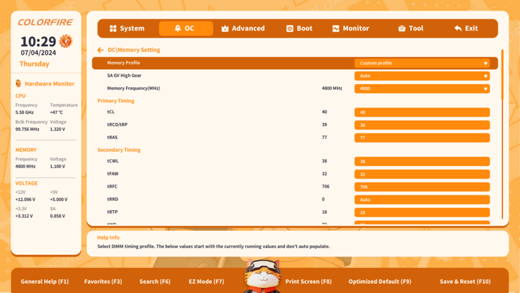橘寶定制BIOS在使用邏輯上也進(jìn)行了優(yōu)化,菜單層級(jí)從三級(jí)調(diào)整為二級(jí),操作使用更直觀,并將同類(lèi)型相關(guān)聯(lián)的子項(xiàng)整合到同一菜單中,不需要多個(gè)頁(yè)面來(lái)回切換;在頁(yè)面下方加入了“幫助提示”,方便用戶了解選項(xiàng)的功能;內(nèi)存超頻現(xiàn)在也添加了實(shí)時(shí)參數(shù)提示,并且簡(jiǎn)化了內(nèi)存超頻的步驟,只需要直接填寫(xiě)目標(biāo)頻率,系統(tǒng)會(huì)自己填寫(xiě)對(duì)應(yīng)的頻率的參數(shù)。