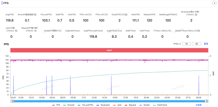 在《原神》游戲中,OPPO Pad 4 Pro能夠以2.1K分辨率畫面+120fps同時開啟運行,經過30分鐘的跑圖實測,我們這臺OPPO Pad 4 Pro測得了平均幀率119.8FPS,游戲體驗非常流暢。