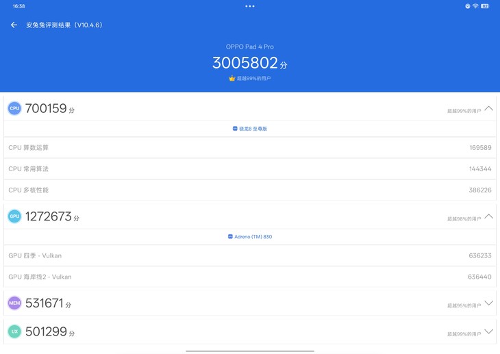 驍龍8至尊版的參數這里就不贅述了,不少網友此前懷疑這款平板搭載了所謂“殘血”版芯片,但不論是300W的安兔兔跑分,還是硬件檢測信息來看來看,OPPO Pad 4 Pro搭載的就是滿血版驍龍8至尊版,這下可以打消大家的顧慮了。此外,它還搭載了潮汐引擎3.0與34857mm2天工散熱架構MAX,性能表現非常穩(wěn)。