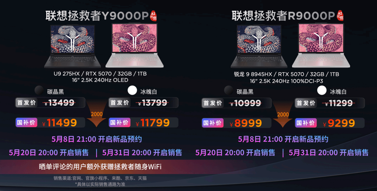 今日正式開售,聯(lián)想給出了誠意滿滿的首發(fā)價格:聯(lián)想拯救者 Y9000P 2025 AI元啟版:碳晶黑首發(fā)價 13499元,國補價11499元;冰魄白首發(fā)價13799元,國補價11799元;聯(lián)想拯救者R9000P 2025 AI元啟版:碳晶黑首發(fā)價10999元,國補價8999元;冰魄白首發(fā)價11299元,國補價9299元,今晚8點正式開售,曬單評論的用戶還可獲贈拯救者隨身WiFi。除此以外,聯(lián)想拯救者Y7000 2025、聯(lián)想拯救者Y7000P 2025、聯(lián)想拯救者 R7000P 2025到手價敬請期待,今晚20點預(yù)約開搶,最高直降2000元,優(yōu)惠力度空前!