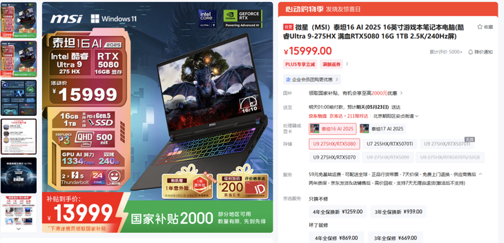泰坦16 AI 2025(U9 275HX + 5080):15999元,國(guó)補(bǔ)到手價(jià)13999元