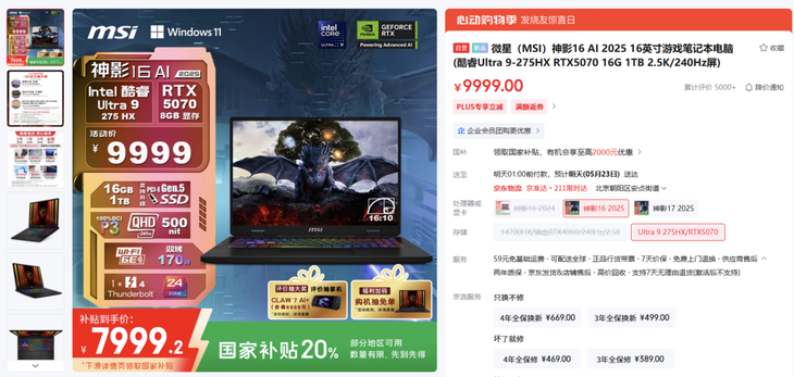 神影16 AI 2025 (Ultra 9 275HX + 5070):9999元,國(guó)補(bǔ)到手價(jià)7999.2元