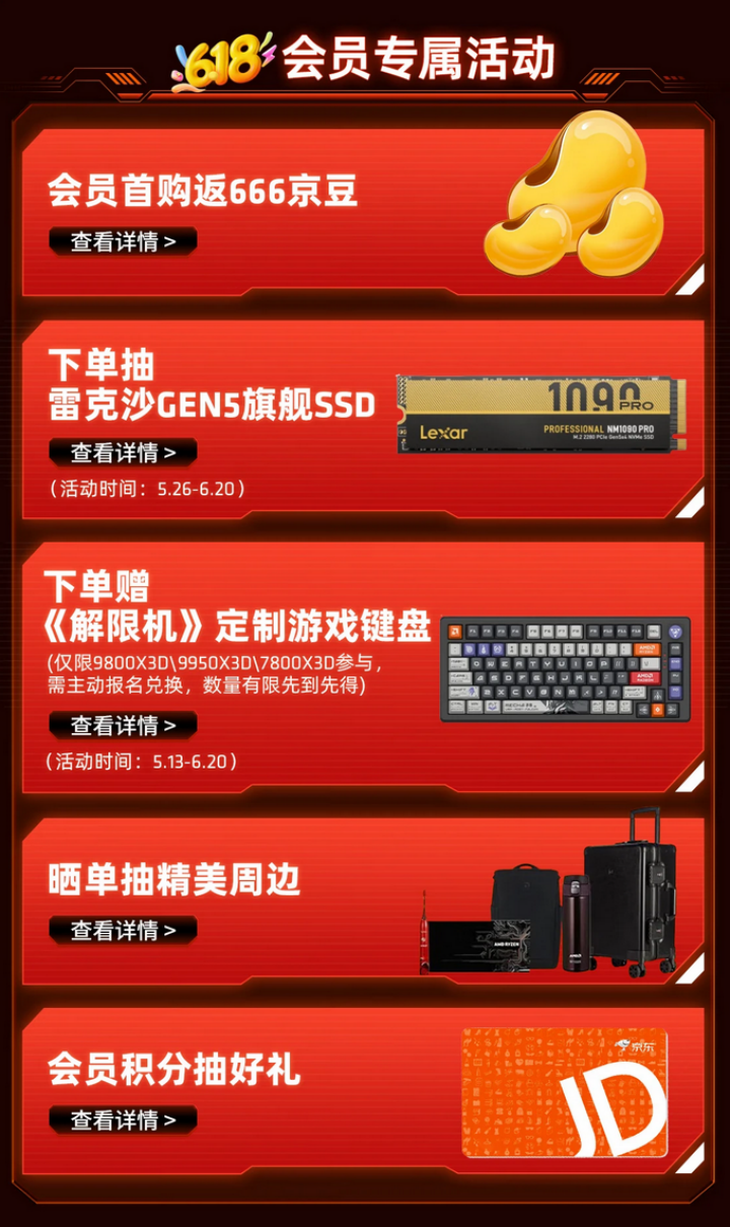 AMD京東自營(yíng)旗艦店618大促今天正處于“AMD會(huì)員日”階段,所以重點(diǎn)當(dāng)然是要來詳細(xì)介紹一下AMD京東自營(yíng)旗艦店會(huì)員們可以享受到的福利。首先建議大家成為AMD京東自營(yíng)旗艦店的會(huì)員之后再來選購(gòu)自己心儀的商品,加入會(huì)員可以抽取周邊好禮,會(huì)員首購(gòu)就返666京豆,累積的積分還能再抽壕禮。活動(dòng)期間所有用戶下單組裝機(jī)產(chǎn)品可以領(lǐng)取每滿999-30的優(yōu)惠券,還可以參與評(píng)價(jià)曬單返京東E卡;下單還能抽雷克沙GEN5旗艦SSD,參與《解限機(jī)》游戲鍵盤兌換活動(dòng),活動(dòng)禮品數(shù)量有限,先到先得。(每項(xiàng)活動(dòng)都限指定型號(hào),請(qǐng)朋友們看清楚下單規(guī)則,更多詳細(xì)活動(dòng)信息請(qǐng)以頁(yè)面顯示為準(zhǔn))。