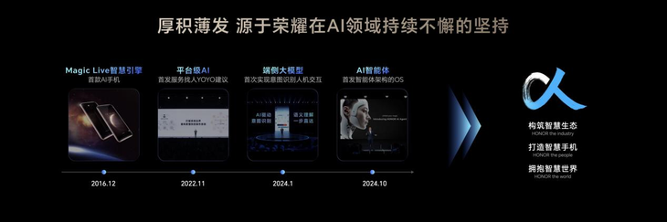 產(chǎn)品只是起點,AI 孕育生態(tài)。自2016年第—代 榮耀Magic系列發(fā)布Magic Live智慧引擎以來,榮耀持續(xù)引領終端 AI 進化,從 2022年榮耀MagicOS 7.0的“服務找人” YOYO 建議,到2024年提出AI終端生態(tài)戰(zhàn)略,再到2025年榮耀阿爾法戰(zhàn)略落地,榮耀持續(xù)突破AI技術邊界。