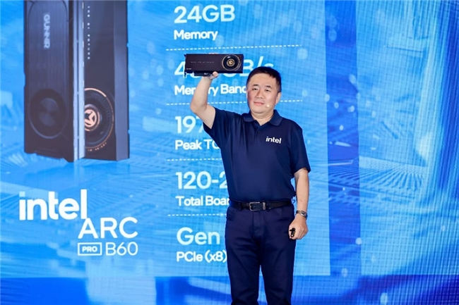 英特爾中國區(qū)技術(shù)部總經(jīng)理高宇展示“一卡雙芯”的英特爾銳炫Pro B60顯卡