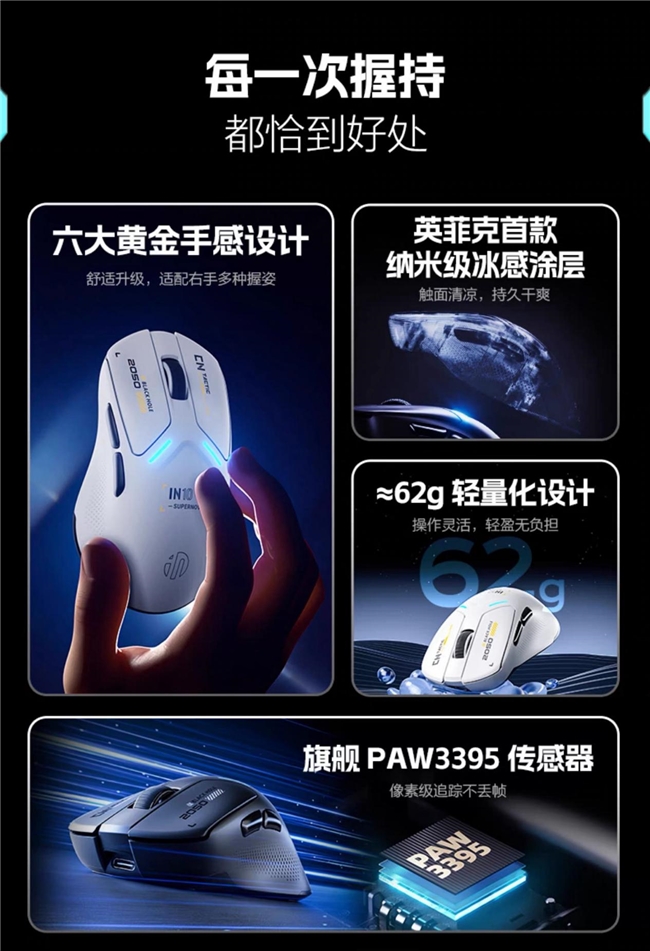 英菲克IN10R右手人體工學(xué)電競(jìng)鼠標(biāo)發(fā)布:3395傳感器+納米級(jí)冰感涂層,首發(fā) 229 元