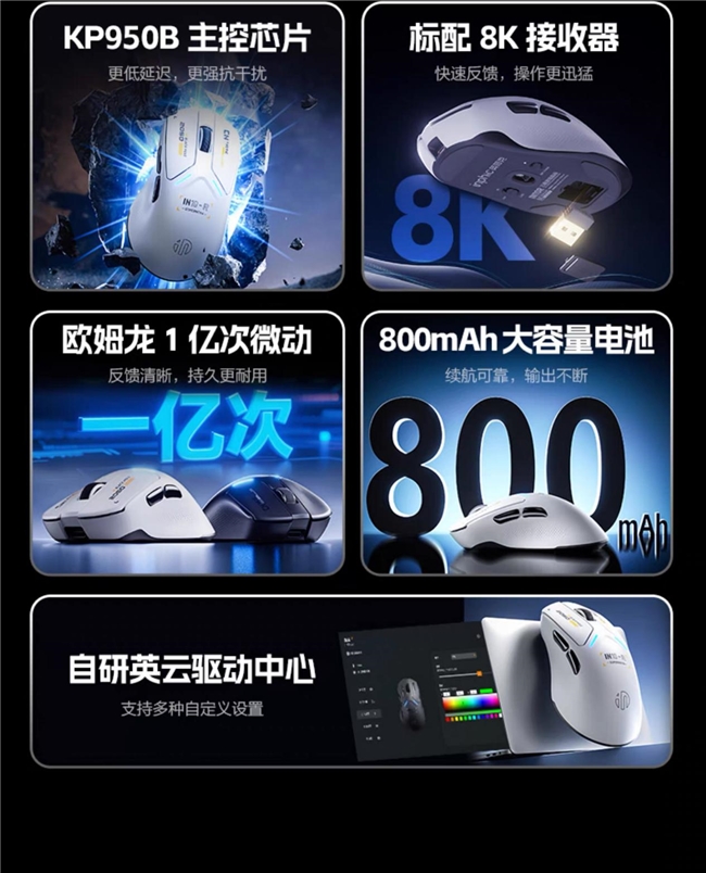 創(chuàng)新支持納米級(jí)冰感涂層,具備抗污吸熱的特性,長(zhǎng)時(shí)間使用不打滑。英菲克定制主控KP950B芯片,搭配PAW3395旗艦傳感器,26000DPI原生采樣+650IPS加速度,標(biāo)配8K傳感器,延遲低至 0.000125s。