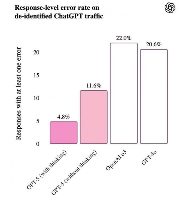 在測試中,GPT-5主力模型在網(wǎng)絡搜索時產(chǎn)生的含有事實錯誤的回答比GPT-4o少了44%,而在深度思考模式下所產(chǎn)生的幻覺概率則比OpenAI o3少了78%。