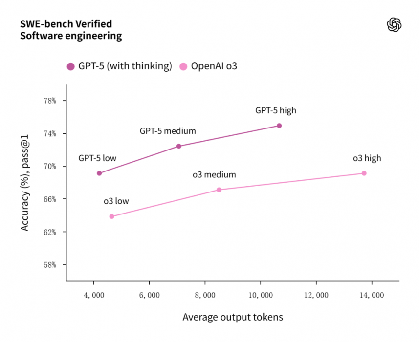 GPT-5與o3在測試中表現(xiàn)隨輸出Token數(shù)變化