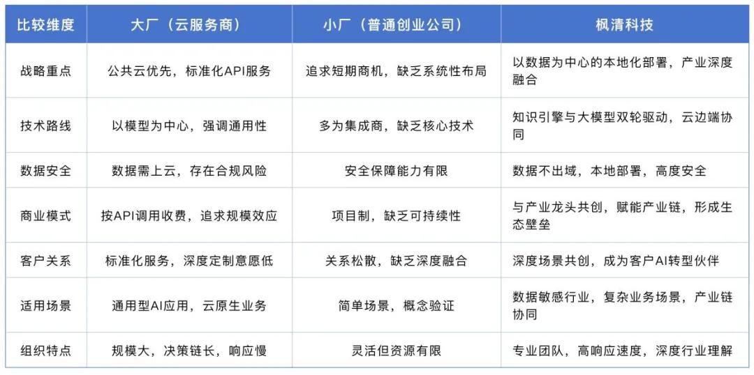 相較于大廠(云服務(wù)商)、小廠(普通創(chuàng)業(yè)公司),楓清科技通過明確的戰(zhàn)略定位和技術(shù)路線,在大廠與小廠之間找到了精準(zhǔn)卡位。
