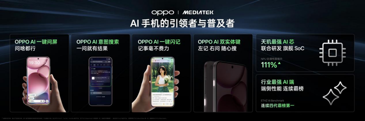 OPPO 作為 AI 手機(jī)領(lǐng)域的引領(lǐng)者與普及者,持續(xù)深耕系統(tǒng)級 AI 技術(shù),先后推出 AI 一鍵問屏、AI 意圖搜索、AI 一鍵閃記等功能,這些成果得益于 OPPO 與聯(lián)發(fā)科聯(lián)合研發(fā)的天璣 AI 芯強(qiáng)勢驅(qū)動(dòng)。新一代 Find X9 系列所搭載的天璣 9500,以 NPU 處理性能提升 111% 的超強(qiáng)算力,幫助 OPPO 打造行業(yè)性能最強(qiáng) AI 端,并讓 OPPO 旗艦成功在端側(cè)AI 性能方面實(shí)現(xiàn) ETHZ AI Benchmark 連續(xù)第四代霸榜第 一,結(jié)合更流暢更智能的 ColorOS 16 系統(tǒng),為用戶帶來新一代最強(qiáng) AI 終端體驗(yàn)。
