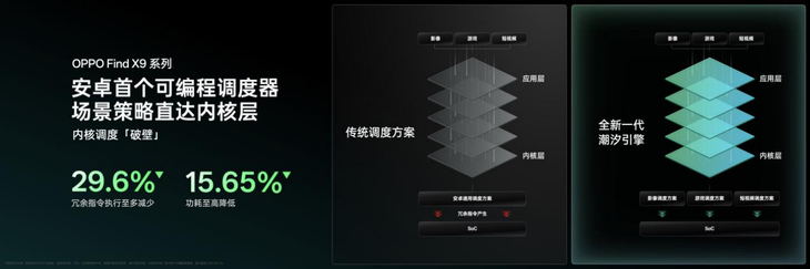 針對用戶高頻的游戲場景,傳統(tǒng)調(diào)度方案因內(nèi)核層對應(yīng)用場景認(rèn)知不足,導(dǎo)致 SoC 執(zhí)行大量冗余指令,游戲長時(shí)間運(yùn)行易出現(xiàn)幀率波動(dòng)。全新一代 OPPO 潮汐引擎搭載安卓首個(gè)可編程調(diào)度器,讓場景策略直達(dá)內(nèi)核層,精準(zhǔn)識(shí)別應(yīng)用真實(shí)需求,為不同游戲場景定制高效調(diào)度方案,冗余指令執(zhí)行至多減少 29.6%,同時(shí)大幅降低功耗至高 15.65% ,首次實(shí)現(xiàn)了游戲“持久滿幀”。
