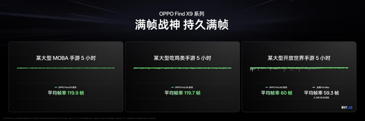在主流 MOBA 手游中,F(xiàn)ind X9系列輕松實(shí)現(xiàn)了最高幀率連續(xù) 5 小時(shí)滿幀運(yùn)行,穩(wěn)定無波動(dòng);即使是在第三方進(jìn)行的大型開放世界手游測試中,F(xiàn)ind X9系列仍可實(shí)現(xiàn)最高幀率 5 小時(shí)全滿幀運(yùn)行,在復(fù)雜場景渲染、高頻技能釋放等場景下幀率始終穩(wěn)定,為用戶帶來真正的“滿幀自由”。與之相比,其他最新發(fā)布的旗艦手機(jī),全程幀率表現(xiàn)波動(dòng)更大,且未達(dá)到4小時(shí)便電量耗盡關(guān)機(jī)。