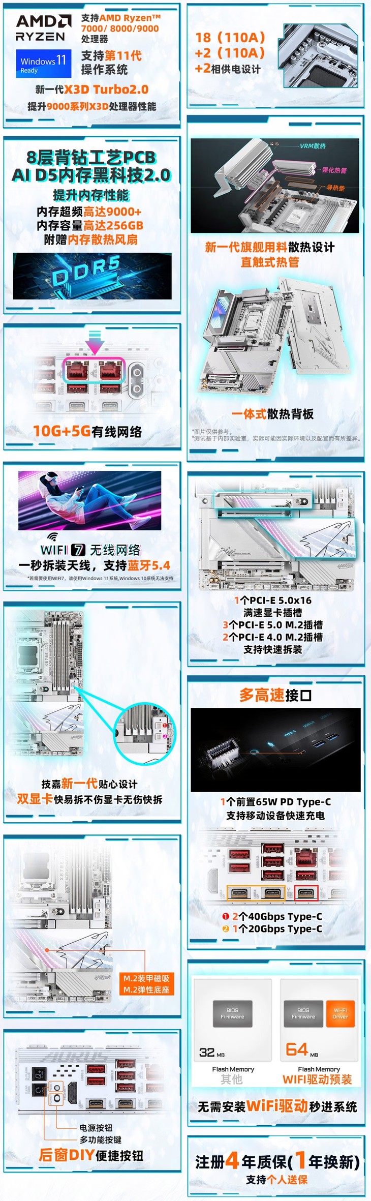 供電方面,主板搭載18(110A)+2(110A)+2相豪華電路,散熱裝甲內(nèi)部集成直觸式熱管,有效降低高負(fù)載下的供電模塊溫度。其核心亮點(diǎn)X3D Turbo2.0技術(shù)無需進(jìn)入BIOS即可一鍵切換模式,通過AI模型動態(tài)優(yōu)化AMD Ryzen X3D處理器的性能,官方稱可提升游戲表現(xiàn)達(dá)25%。為保障高頻信號穩(wěn)定性,主板采用8層背鉆工藝PCB,并搭載AI D5黑科技2.0技術(shù),最高支持DDR5-9000+內(nèi)存頻率和256GB(4×64GB)容量,還附贈專屬內(nèi)存散熱風(fēng)扇以滿足極限超頻需求。