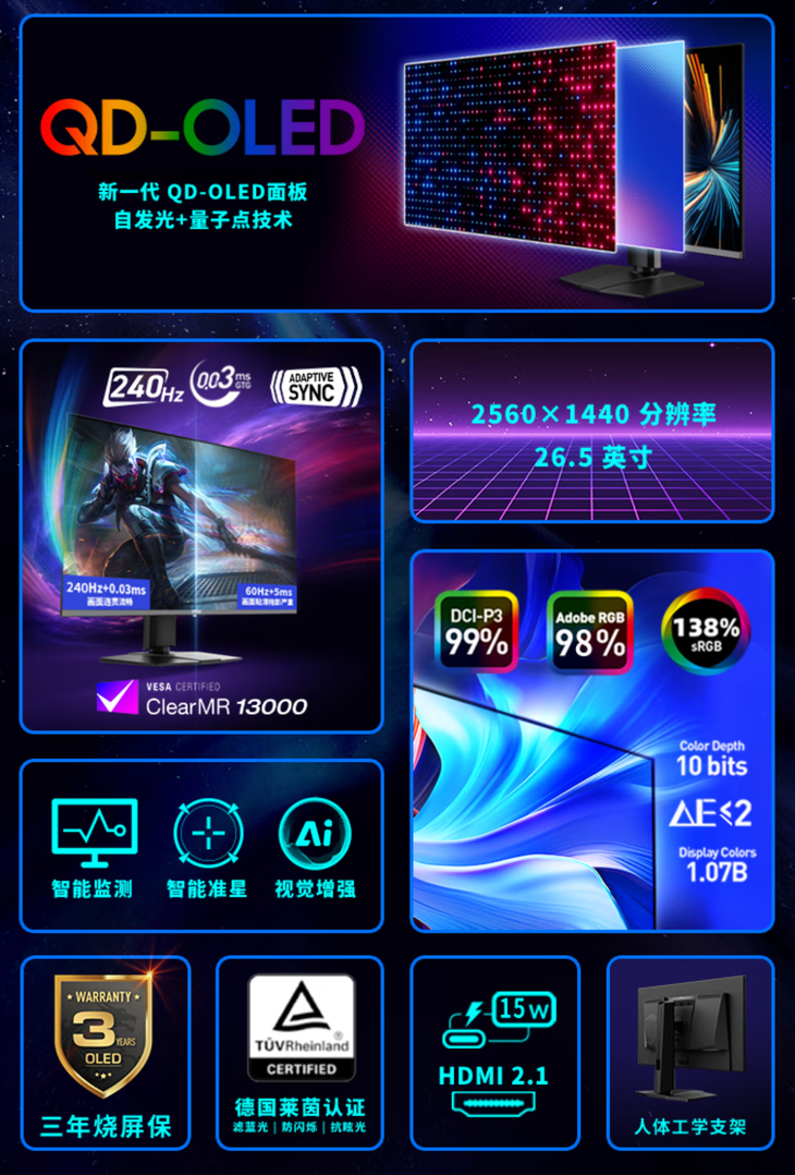 微星推出MAG 272QP QD-OLED X24,2K240Hz售2999元