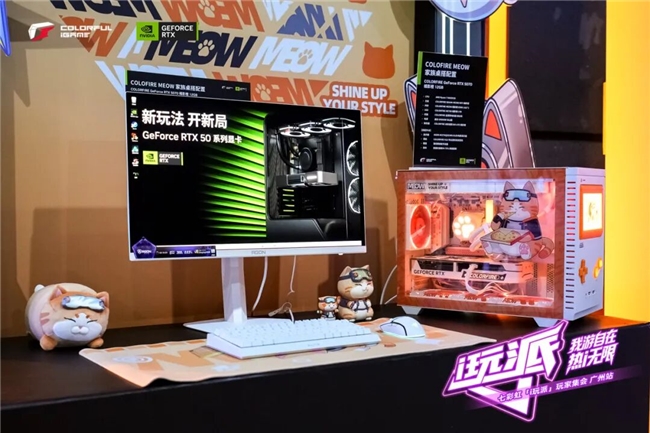 除了硬核性能,七彩虹還打造了高顏值桌搭體驗(yàn)區(qū)。一套是iGame 柒小希IP桌搭,白粉配色搭配柒小希首發(fā)紀(jì)念版RTX 5070顯卡,甜酷中透著戰(zhàn)斗力,深受二次元與DIY愛好者青睞;另一套是COLOFIRE MEOW橘貓電競(jìng)房,采用橘影橙RTX 5070顯卡與大量萌系裝飾,營(yíng)造出可愛賽博風(fēng)。兩套桌搭均搭載26.5英寸QD-OLED屏的AGON電競(jìng)顯示器AG276QSD/WS,它支持360Hz高刷新率、VESA DisplayHDR? True Black 400認(rèn)證與Quantum Dot量子點(diǎn)技術(shù),兼顧疾速響應(yīng)與精準(zhǔn)色彩。不僅滿足電競(jìng)需求,也以純白外觀與極簡(jiǎn)設(shè)計(jì),成為“實(shí)力與顏值兼?zhèn)洹钡淖来钪x。